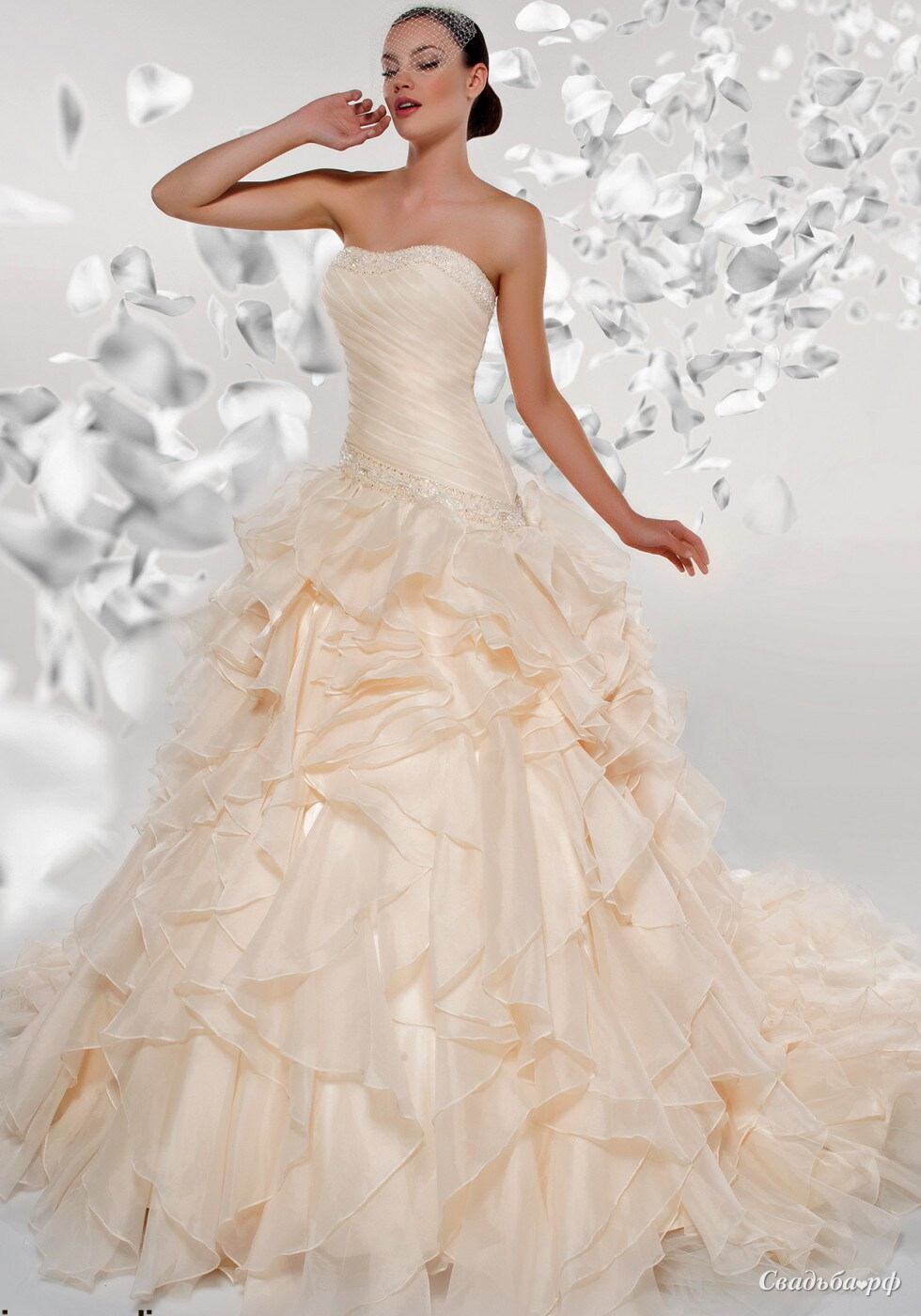 Шикарное свадебное платье Pierre Cardin. Элегантный удлинённый корсет украшен изысканной диагональной драпировкой. По контуру открытого лифа, а также по заниженной лини талии проходит расшитая сверкающим бисером и бусинами широкая тесьма. Великолепная пышная юбка состоит из огромного количества невесомых оборок, каскадом переходящих в шлейф.