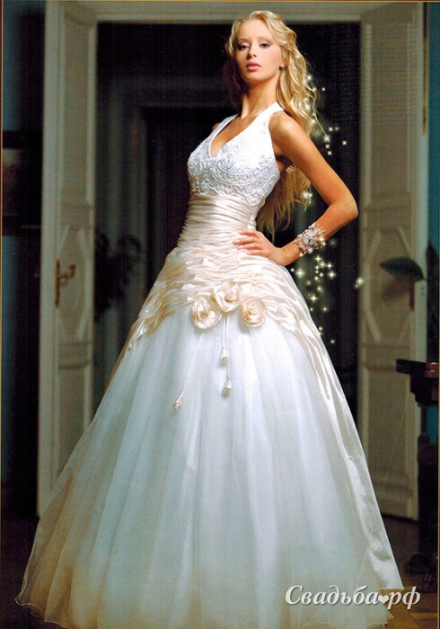 Свадебное платье с декорированным лифом. Роскошная рельефная вышивка полностью покрывает лиф с глубоким V-образным вырезом. Корсет и верхняя часть пышной фатиновой юбки задрапированы гладким атласом. Великолепная цветочная композиция, выполненная из атласа и расположенная на боку, делает образ по-королевски изысканным и утончённым.