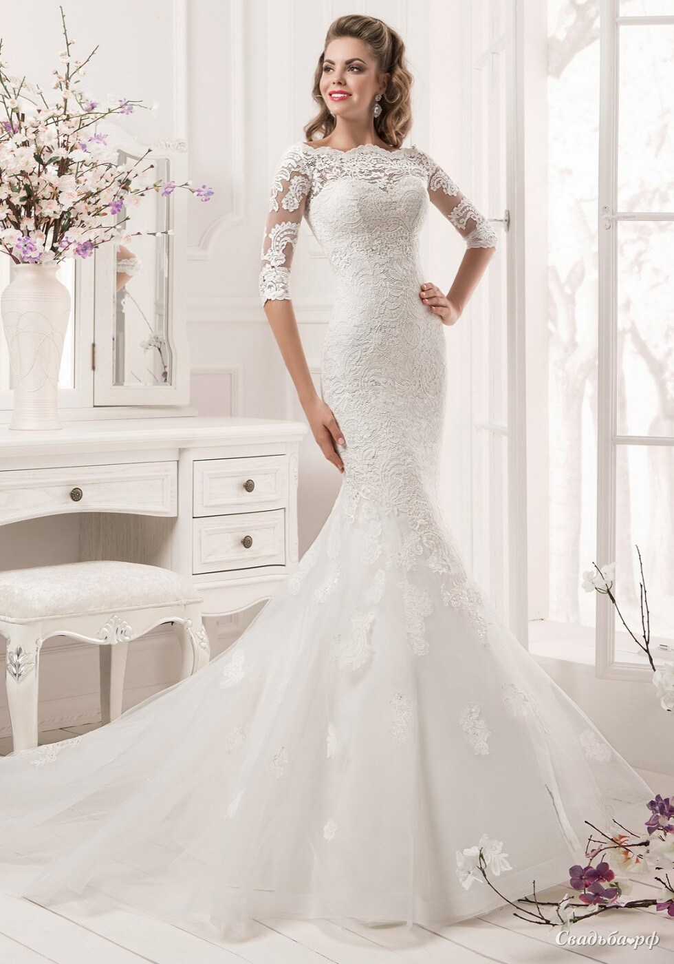 Свадебное платье силуэта "рыбка", по всей длине декорированное нежным кружевом с мелким рисунком. Лиф открытый, в форме сердечка, придает платью соблазнительности. Образ можно дополнить кружевным болеро (как на фото) с рукавами в три четверти и вырезом - лодочка.