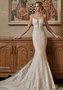 Силуэтное свадебное платье на капучиновом подкладе с расклешением от колена. С большим вырезом в области декольте. С открытой спиной, покрытой невидимой тонкой телесной сеткой.