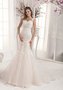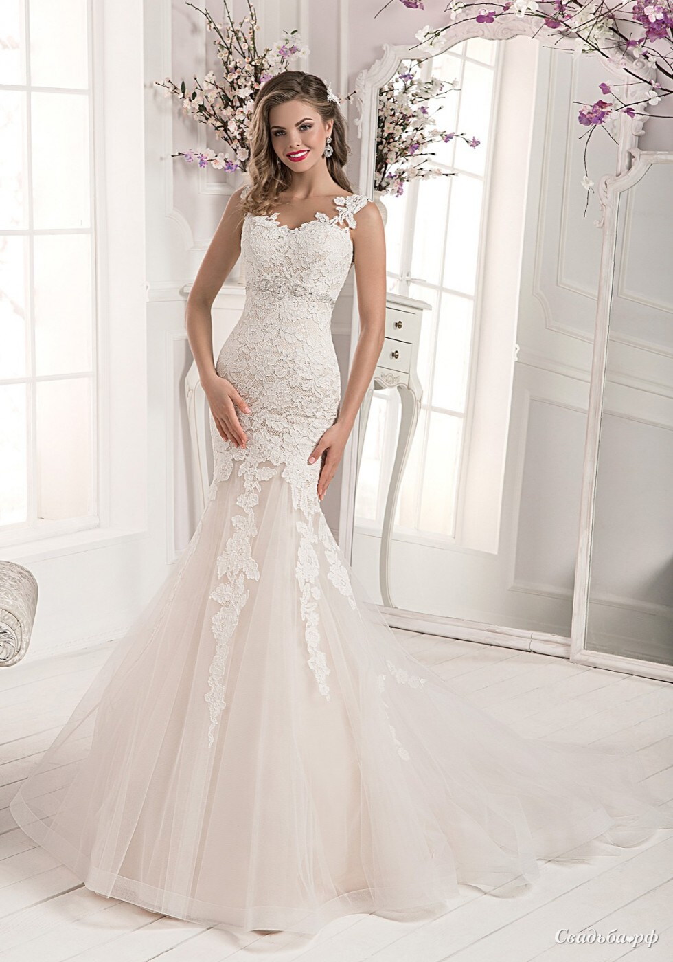 Свадебное платье силуэта "русалка" с легким оттенком слоновой кости и с выразительным кружевным декором, который придает свадебному платью уникальный характер. Длинный пышный шлейф придает платью элегантности и легкости. Открытый лиф в виде сердечка с симметричными бретелями, декорирован кружевом с крупным рисунком. Линия талии выделена ярким поясом, расшитым по всей длине бисером.