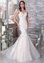 Кружевное свадебное платье привлекает внимание стильным силуэтом «русалка». Дизайнеры играют не только с фактурой, используя гипюр, но и с цветом. Бежевый оттенок сатина пикантно просвечивается под торжественным шифоном. Рукава отсутствуют, имеется сердцеобразный лиф.