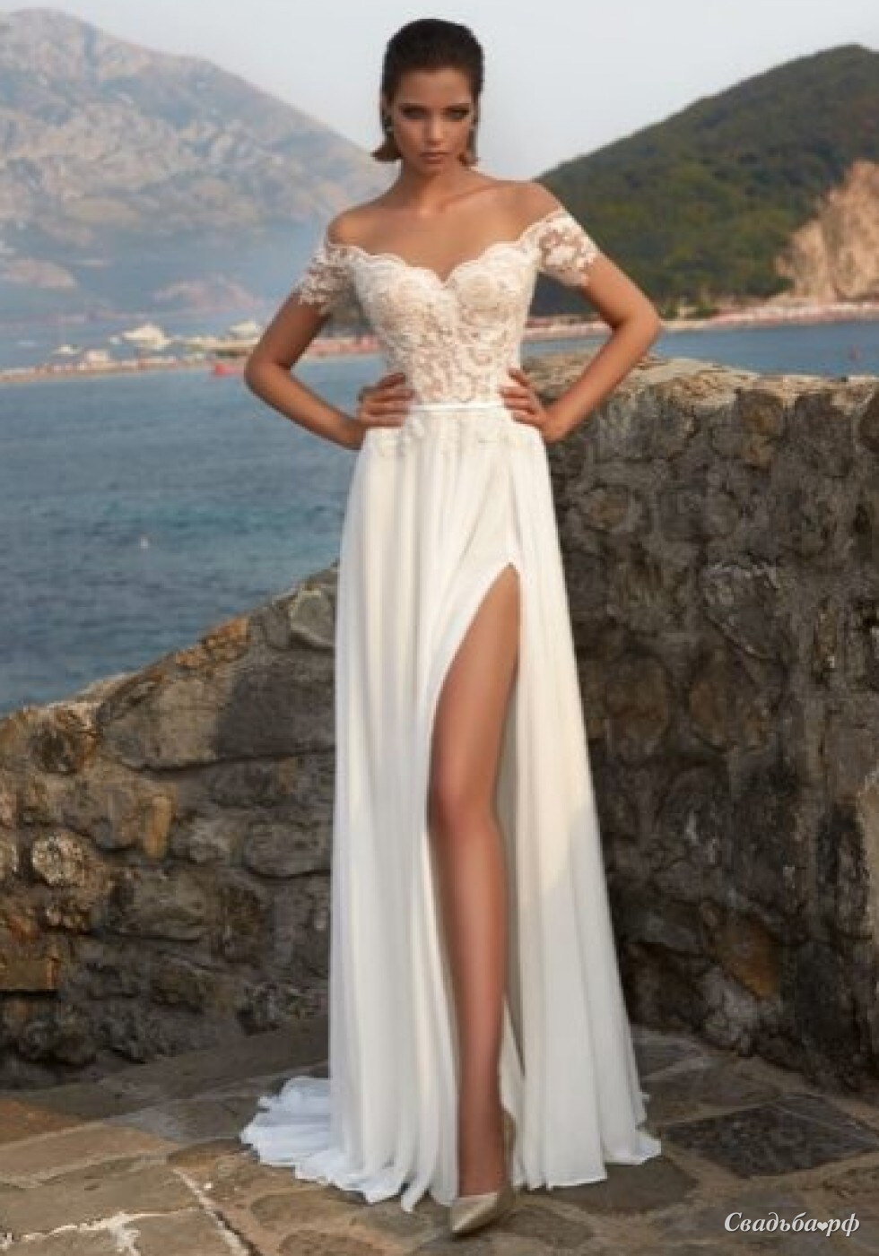 длинное шифоновое платье с разрезом на ноге и кружевным лифом