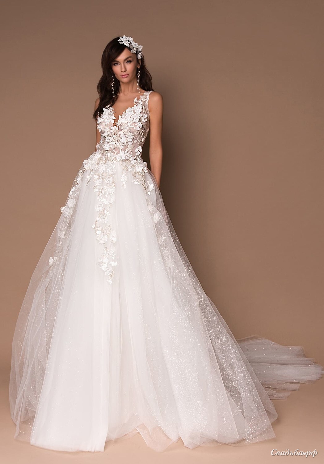 Свадебное платье с открытой спинной, декорированные цветочным принтом. Юбка платья мерцающая.