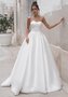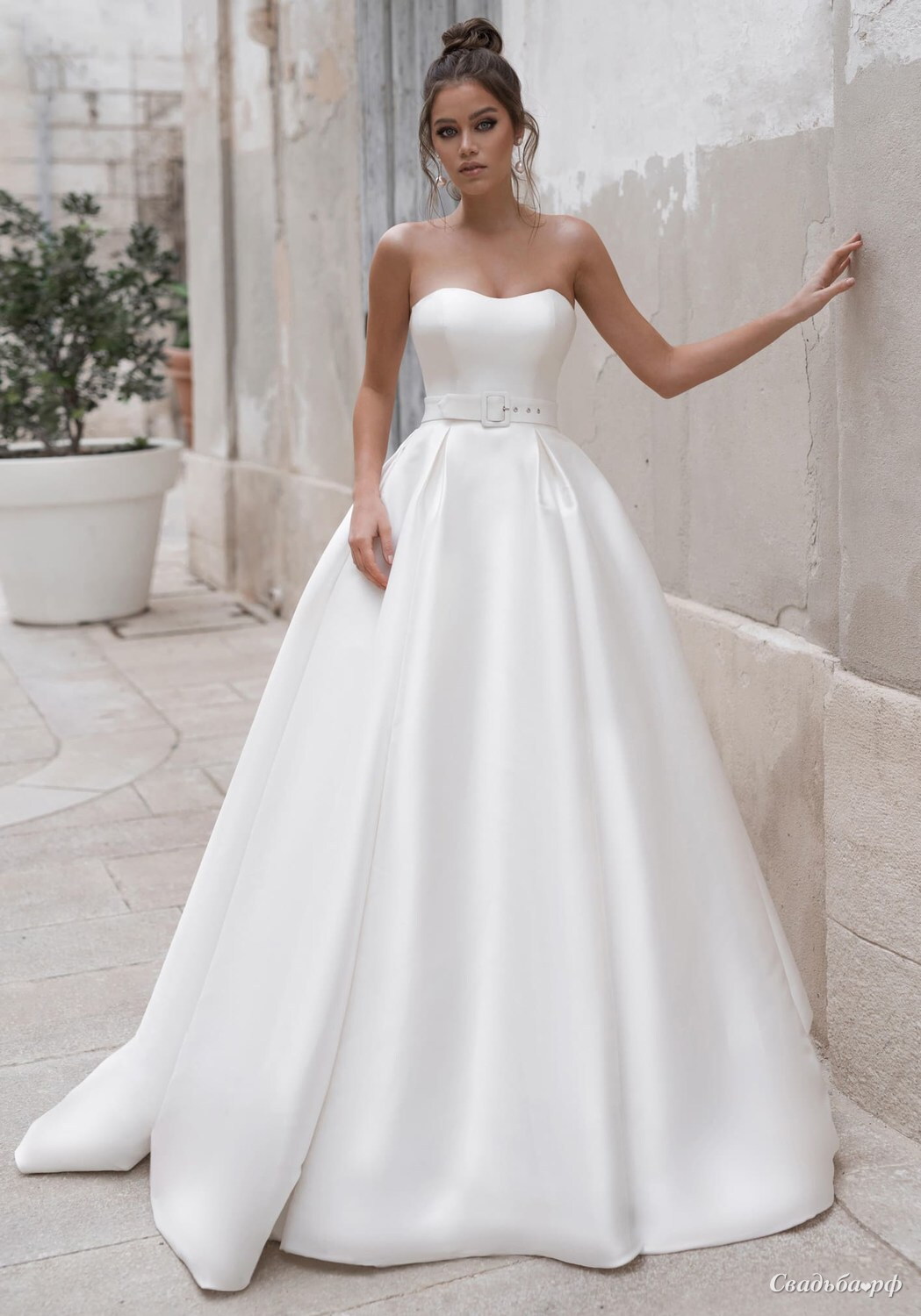Атласное свадебное платье в стиле минимализм со съемным болеро. Платье дополнено оригинальным поясом, который подчеркивает талию.