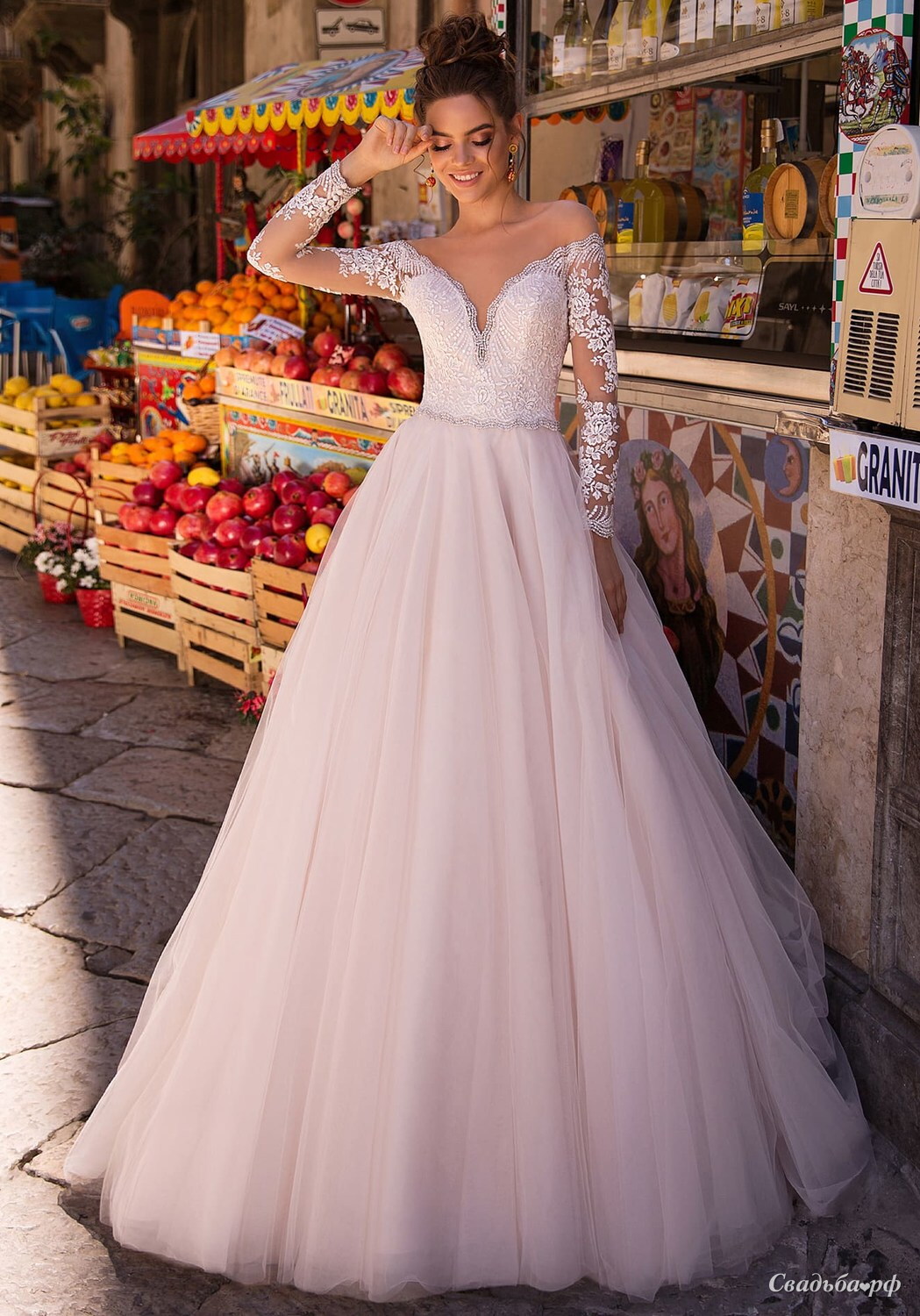 Очаровательное свадебное платье со шлейфом изысканного оттенка пудра, выполненное в А-силуэте. Платье дополнено элегантным рукавом.