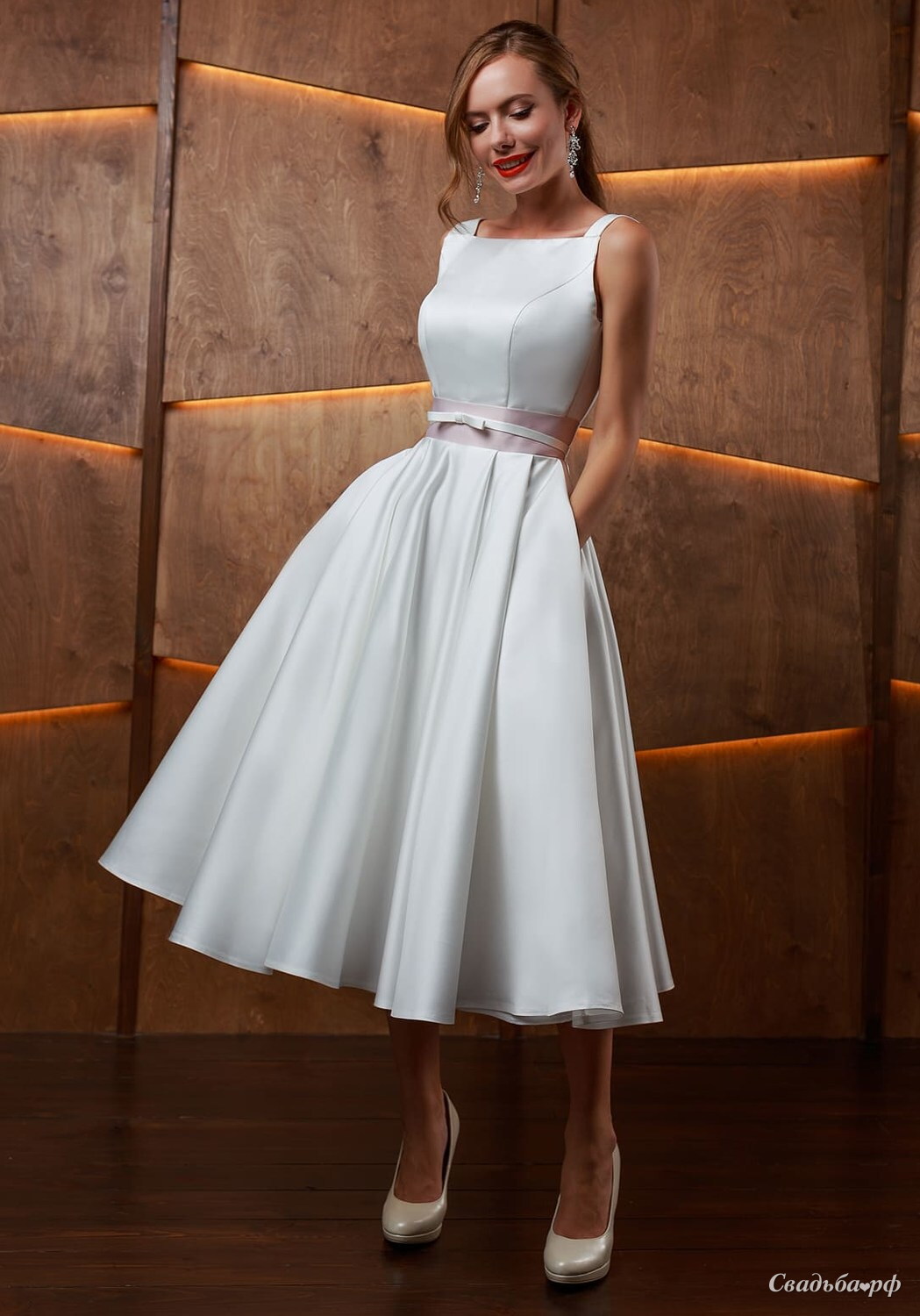 Свадебное платье в ретростиле из белого блестящего атласа. Декольте платья закрыто, а спинка полностью открыта. Талия подчеркнута широким поясом пудового оттенка.