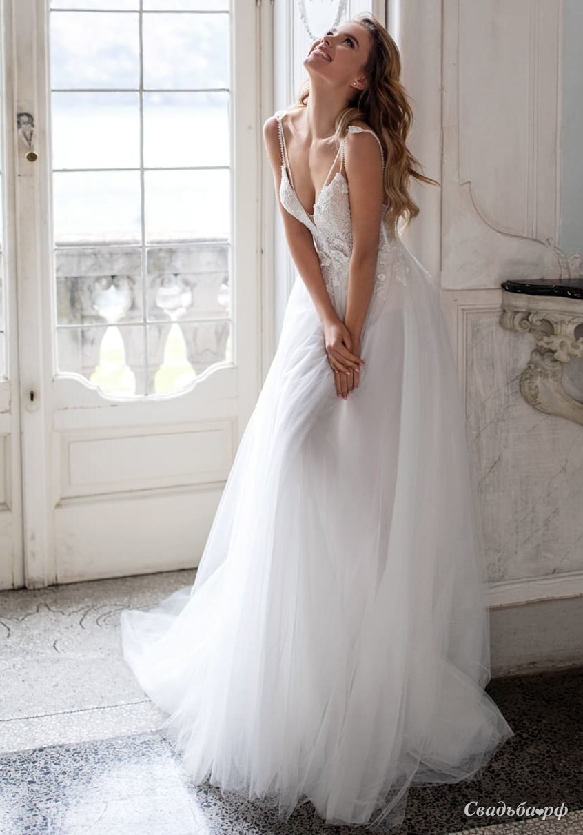 Легкое свадебное платье с открытой спиной и воздушной трапециевидной юбкой из фатина с небольшим шлейфом. Тонкие тройные бретели расшиты бисером и на плечах украшены небольшими цветами.