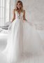 Cвадебное платье А-силуэта с юбкой из фатина. Корсет покрыт фактурными аппликациями с цветочным принтом. Закрытая спинка оформлена на прозрачной сетке на пуговицах.