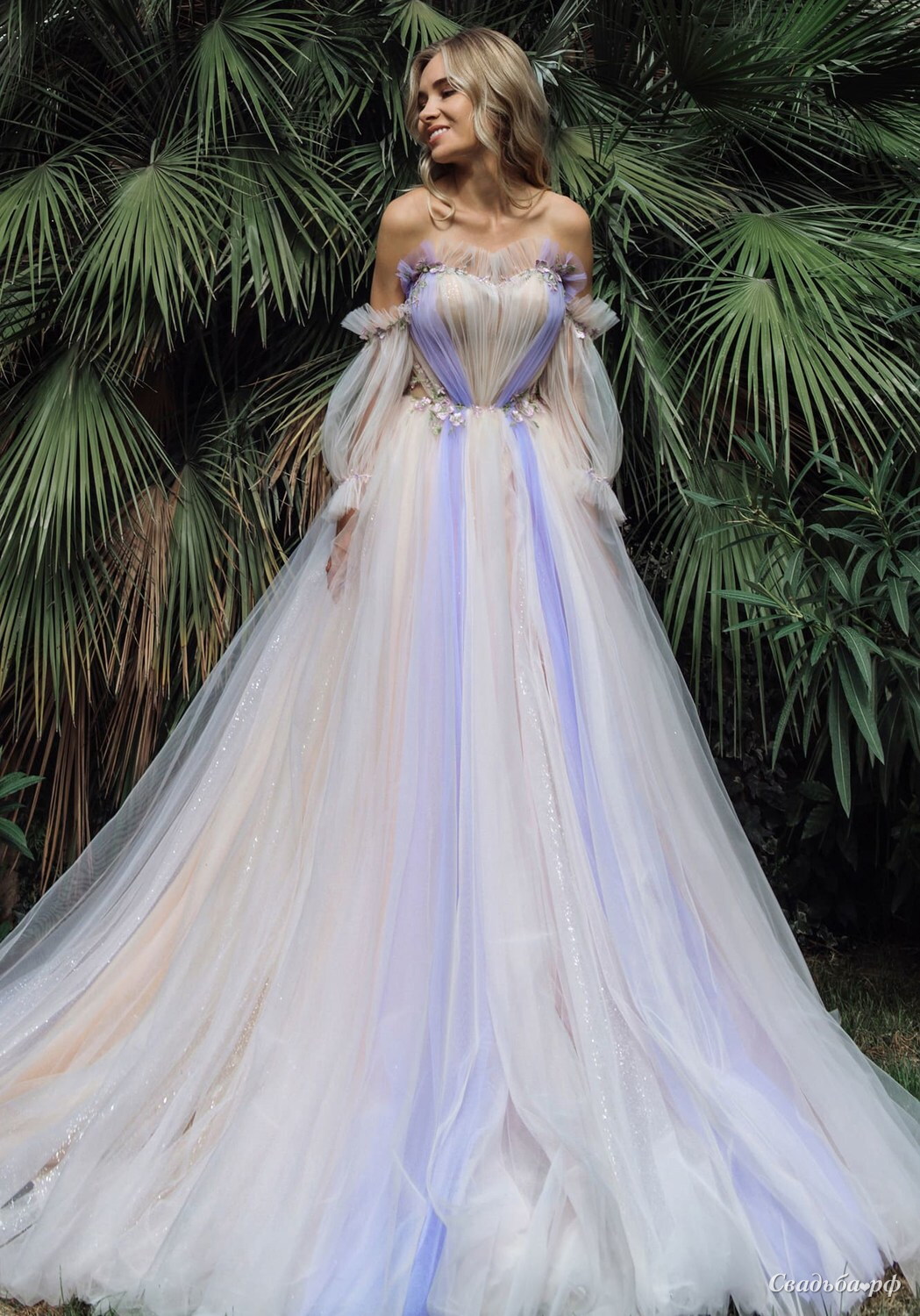 Мерцающее свадебное платье с яркими цветными вставками. Воздушные отстегивающиеся рукава с рюшами дополняют этот яркий образ.