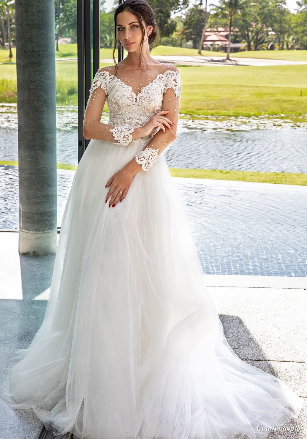 Удивите женственной красотой в многослойном воздушном свадебном платье. Верх декорирован изящными аппликациями из кружева, создающими иллюзию обнаженной кожи.