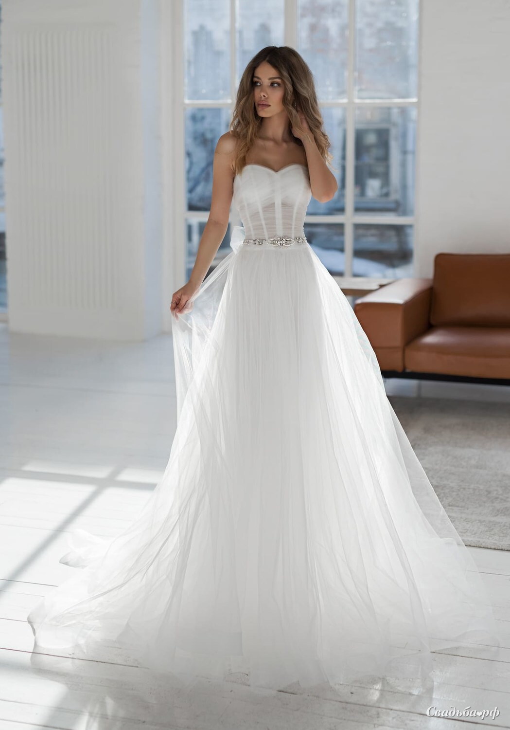 Пышное свадебное платье из невесомого прозрачного фатина – воплощение нежность и легкости. Полупрозрачный корсет с вырезом «сердечком», пояс украшенный камнями, который делает акцент на талии и длинная юбка из фатина - ничего лишнего в образе.