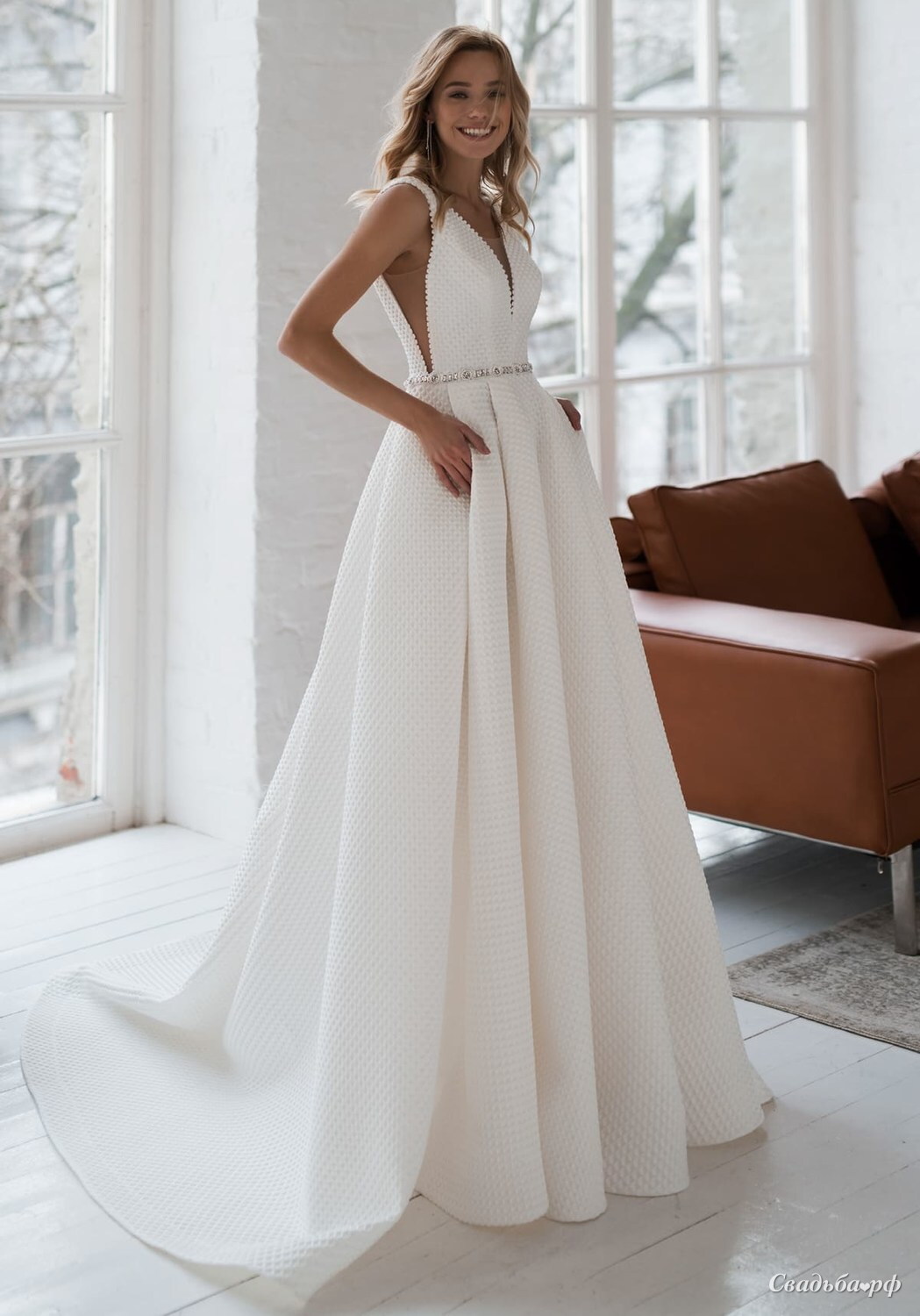 Свадебное платье в стиле минимализм из фактурного крепа с нежным рисунком в мелкую клеточку. Лиф на тонких бретелях с V-образными вырезами по бокам, на груди и спине, подчеркнут единственной декоративной деталью – блестящим поясом из камней. Пышные складочки по юбке делают невесту в таком платье более игривой.
