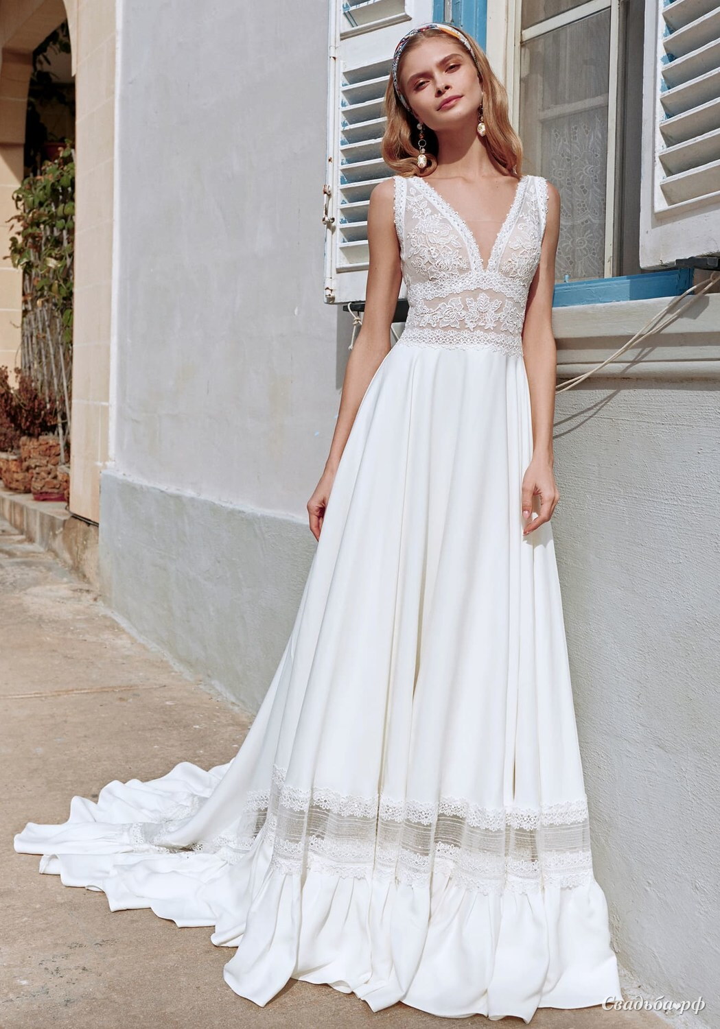 Нежное свадебное платье в этническом стиле. Кружевной лиф с V-образными вырезами на груди и спине дополняет прямая юбка из шифона.