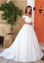 Лаконичное свадебное платье из атласа кремового оттенка с открытой линией плеч.
