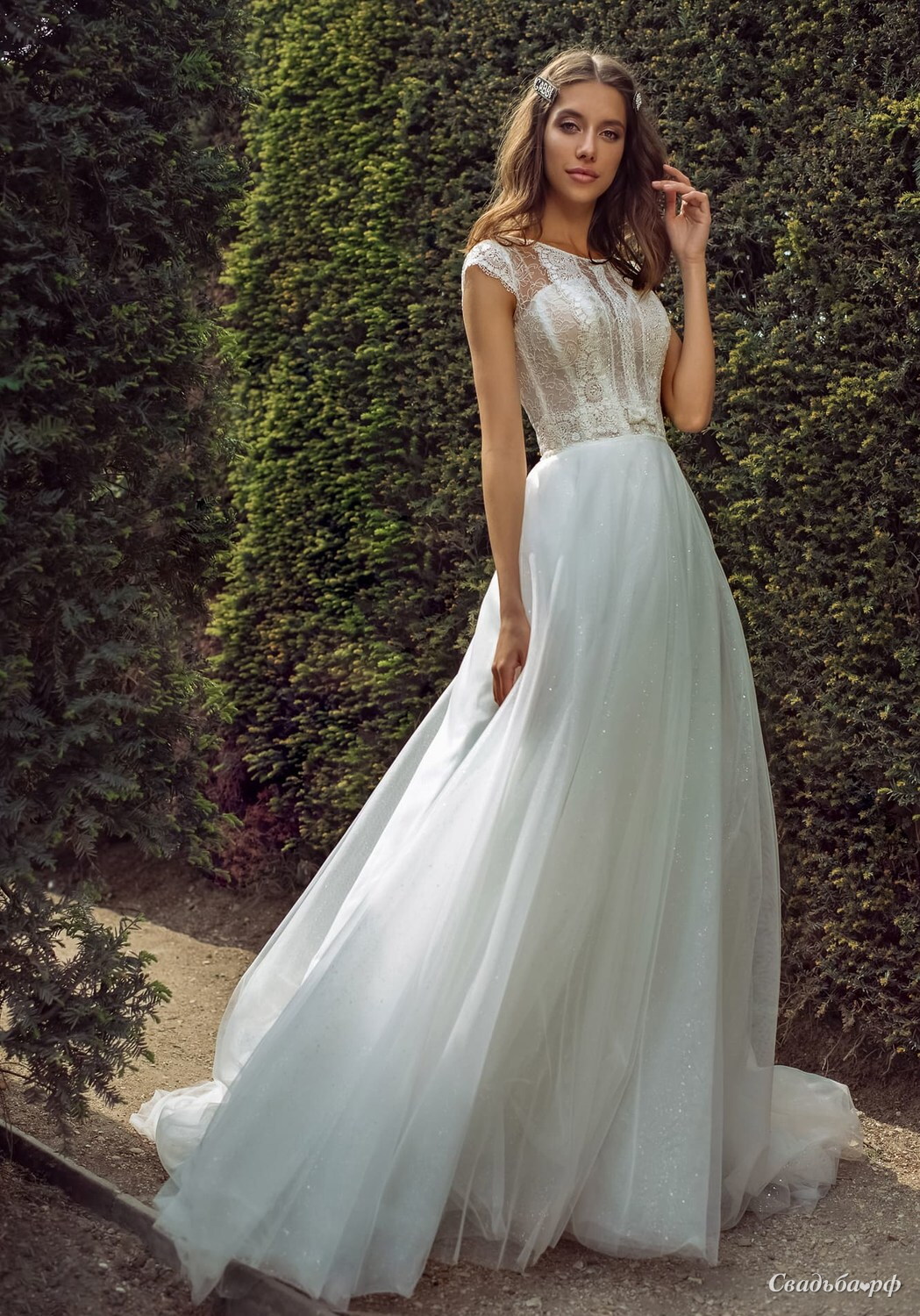 Свадебное платье с закрытым корсетом и мерцающей легкой юбкой из фатина. Акцент на талии выполнен благодаря тонкому бантику.