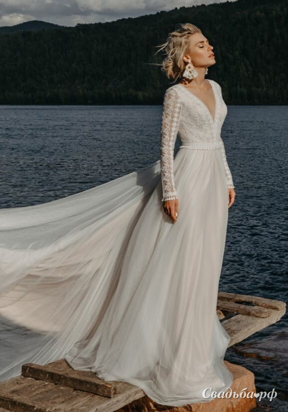Свадебное платье в стиле бохо с нежным кружевным корсетом и открытой спинкой. Юбка выполнена из воздушного фатина с длинным шлейфом.