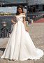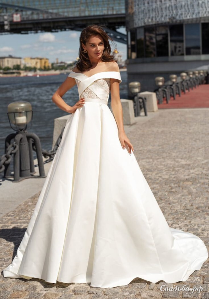 Роскошное свадебное платье из атласа жемчужного оттенка с портретным декольте и юбкой из атласа, выполненной с банановыми складками, переходящей в длинный шлейф.