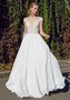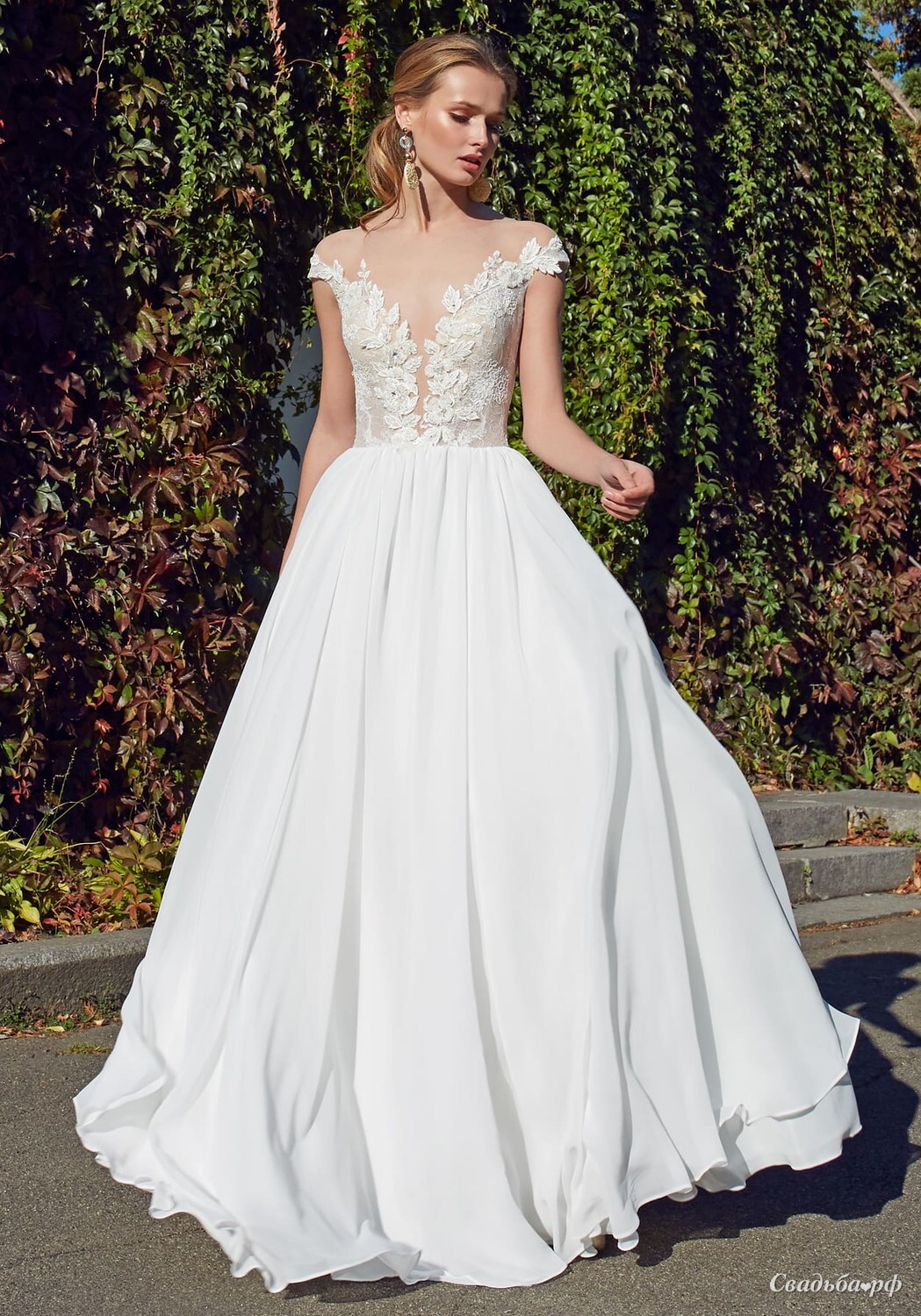 Свадебное платье с легкой юбкой из шифона и кружевным лифом. Рисунок на корсете выполнен с цветочными мотивами.