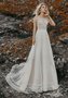 Оригинальное кружевное свадебное платье кружевная отделка имитирует открытую линию плеч в форме лодочки, но верх закрыт тончайшей тканью. Кружевная юбка переходит в небольшой шлейф.
