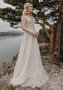 Свадебное платье А-силуэта с длинным рукавом и юбкой, дополненной горизонтальными рюшами. На талии тонкий пояс.