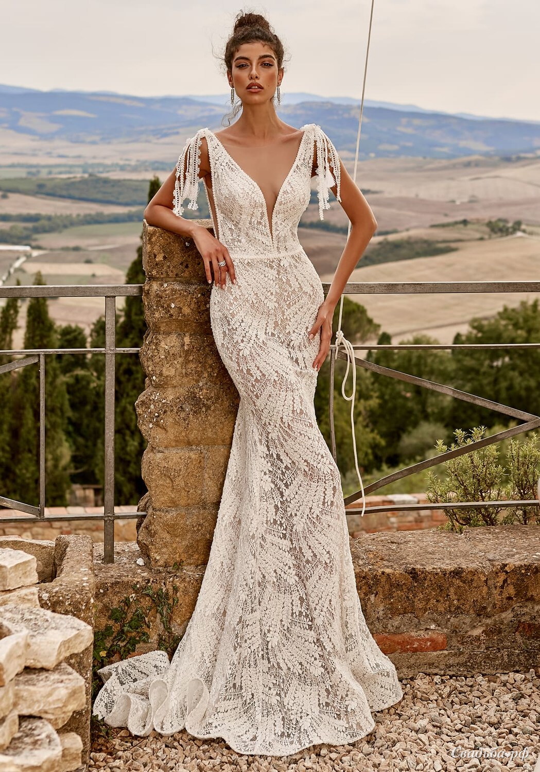 Свадебное платье из винтажного кружева, украшенное кисточками на плечиках. Лиф с глубоким вырезом в зоне декольте, спинка открыта.