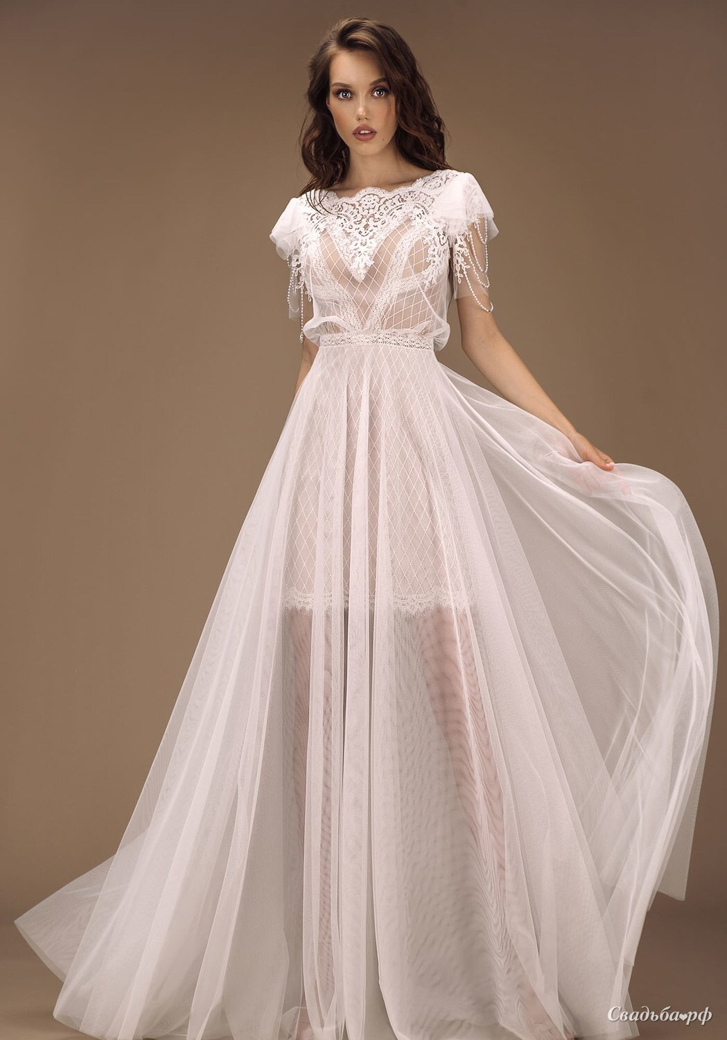 Легкое свадебное платье из фатина и кружева. Короткая модель внутри дополнена ниспадающим шлейфом из фатина.