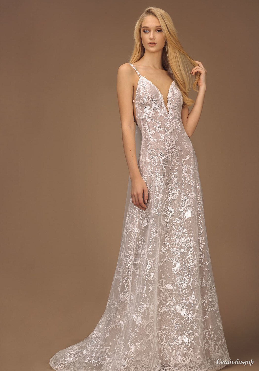 Свадебное платье из мерцающей ткани в бельевом стиле. Спинка открыта и украшена тонким лямочками.