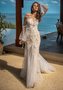 Кружевное свадебное платье с крупным кружевом силуэта русалка. Свободные рукава перекликаются с фатином на подоле юбки.