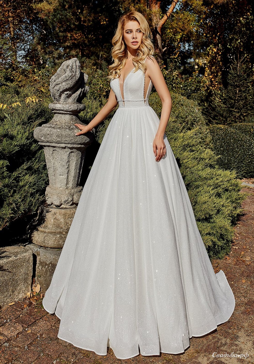 Блестящее сверкающее пышное свадебное платье с глубоким V-образным вырезом и открытой спинкой.