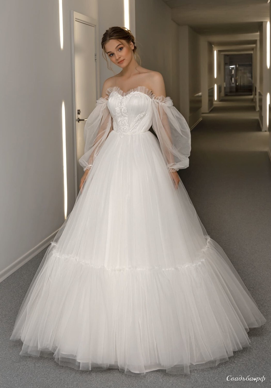Пышное свадебное со свободными рукавам, обрамлено рюшами и складками.