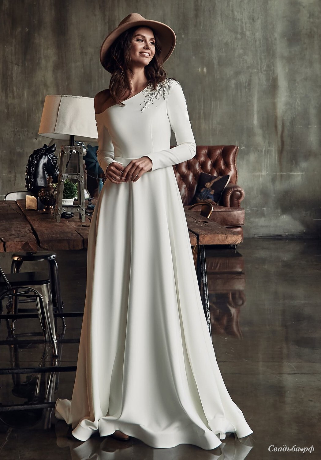 Прямое свадебное платье в стиле минимализм из атласной ткани. Плечо украшено бусинами расшивам из бисера.