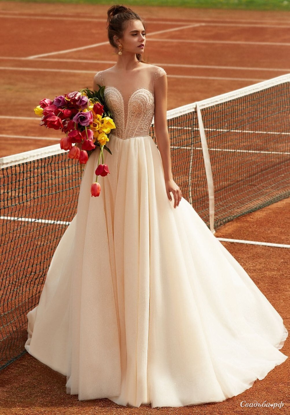 Пышное свадебное платье персикового цвета с открытым корсетом, усыпанным мерцающими камнями.