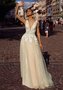 Лаконичное свадебное платье с глубоким вырезом в зоне декольте.