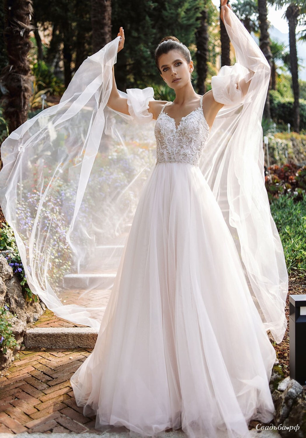Изысканное свадебное платье с мерцающим корсетом и съемными рукавчиками. Юбка выполнена из воздушного фатина.
