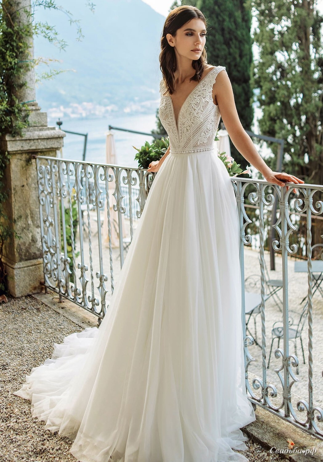 Нежное свадебное платье в стиле рустик с кружевным лифом и юбкой из фатина цвета айвори.