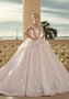 Пышное свадебное платье с баской. Кружево белого цвета ярко выделяется на подкладке розового цвета.