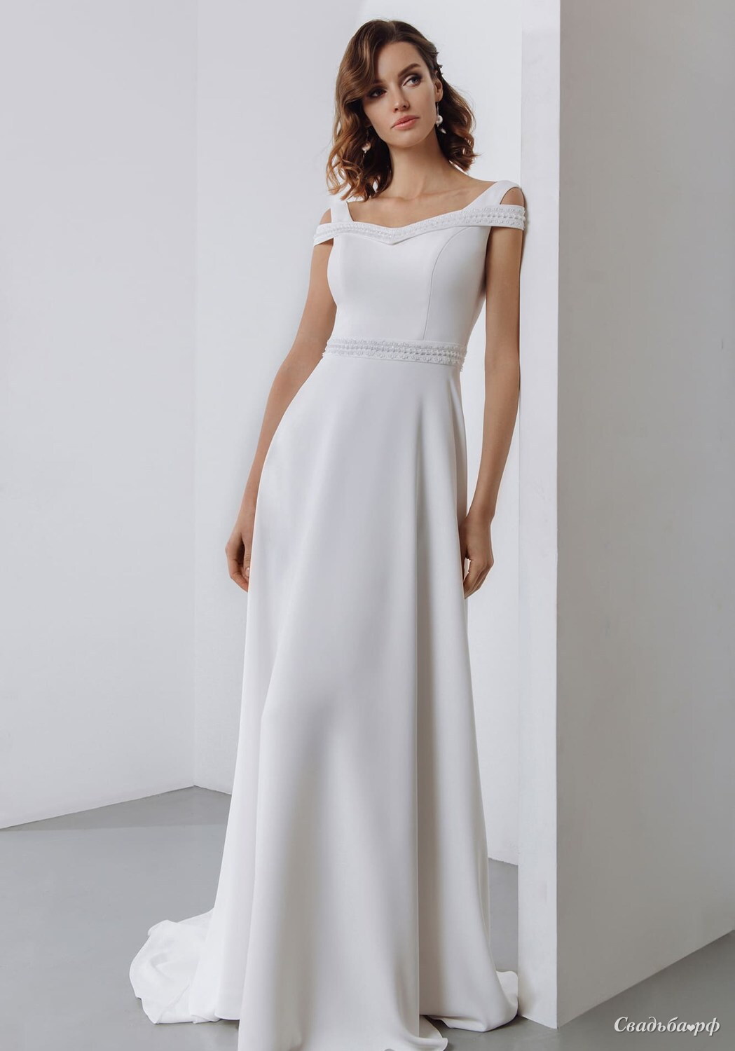 Сдержанное свадебное платье приталенного силуэта из гладкого белого крепа. Лиф дополнен двойными бретелями.