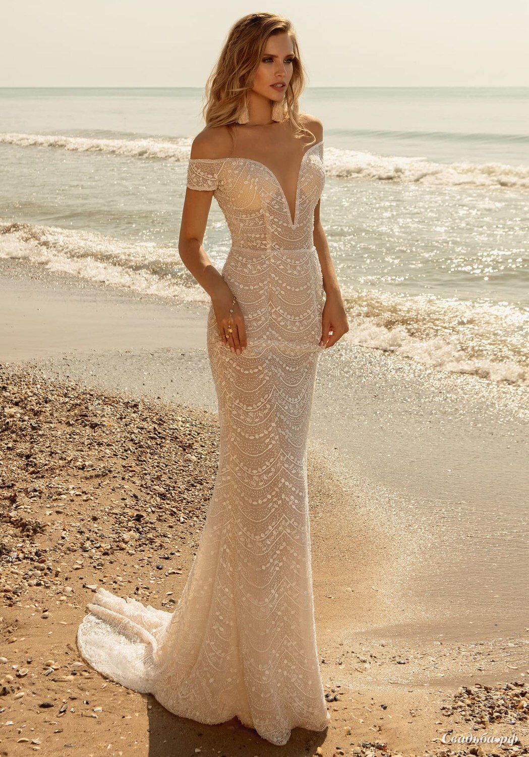 Прозрачное кружевное платье пудрового оттенка. Глубокий вырез открывает зону декольте, а спущенные короткие рукава обнажают плечи и подчеркивают ключицы.