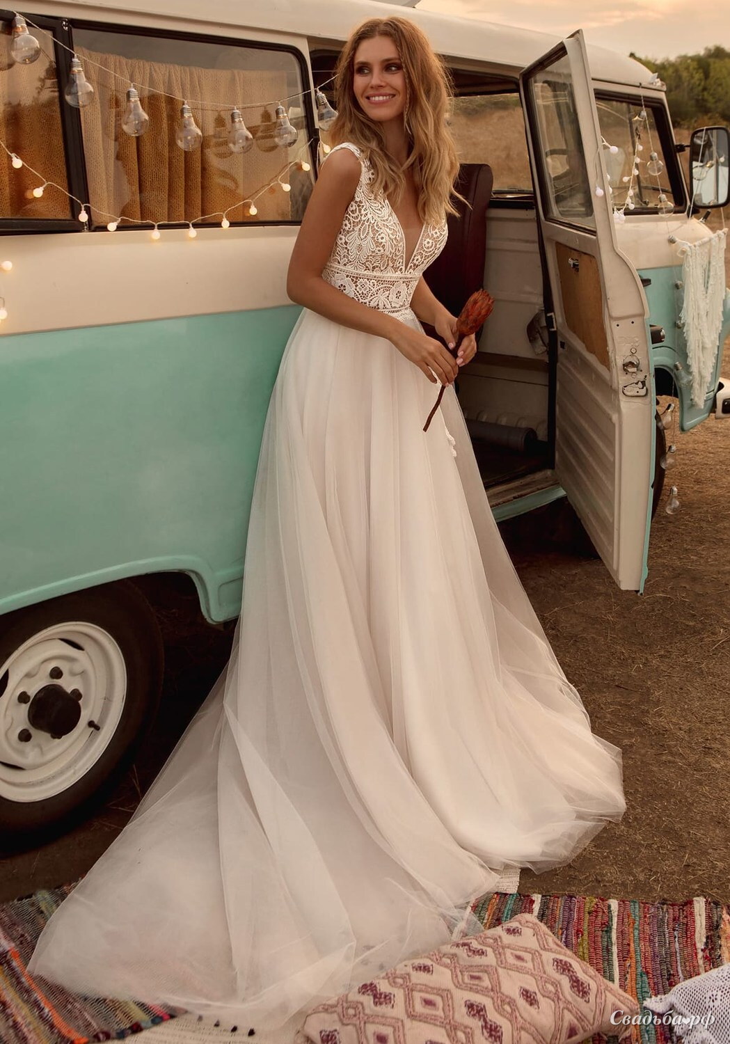 Легкое свадебное платье в стиле рустик с кружевным корсетом.