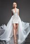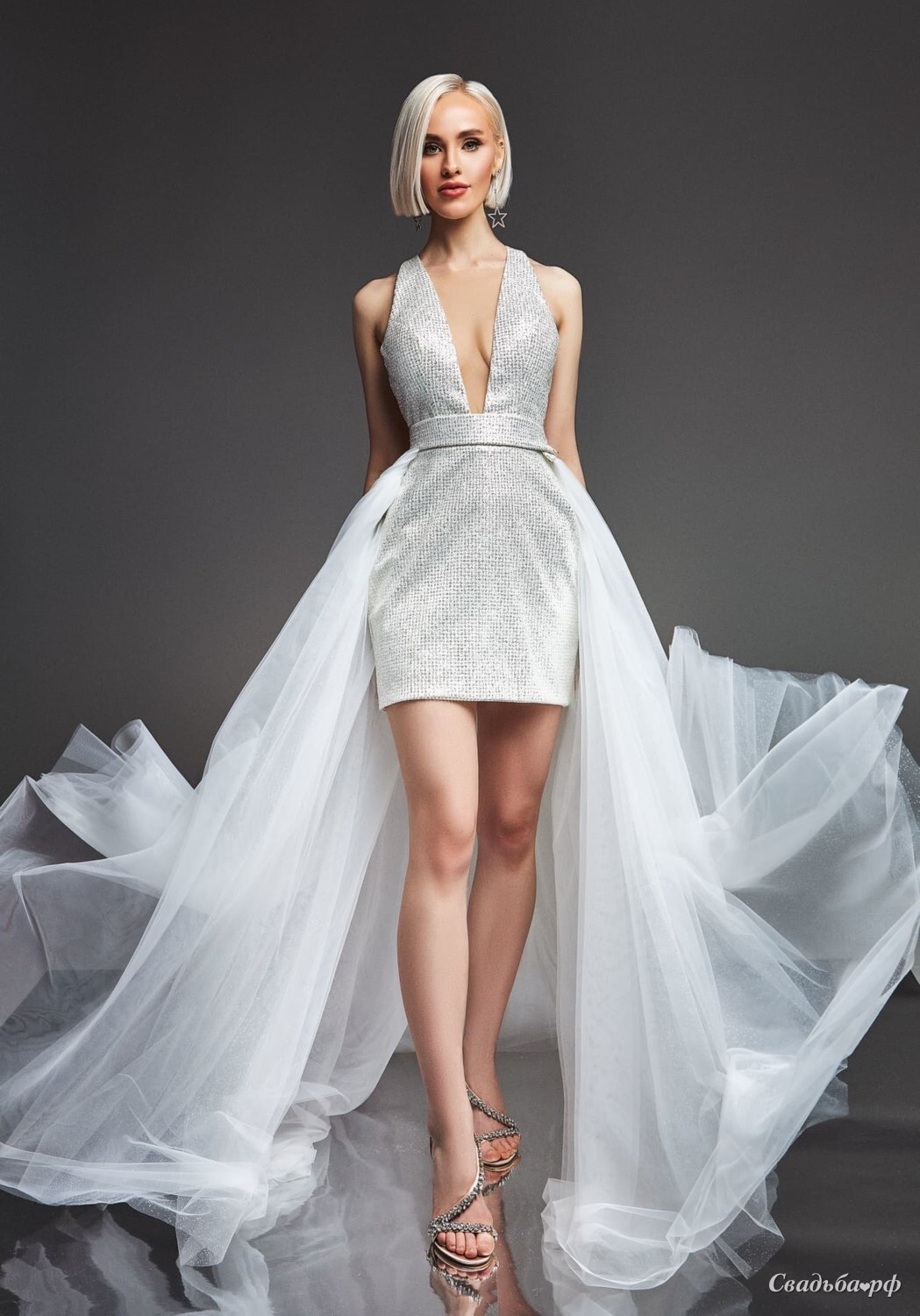 Роскошное серебристое свадебное платье из мерцающей ткани. Длина мини дополнена съемным шлейфом из фатина.