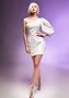 Необычное свадебное платье длины мини. Зона декольте оформлена асимметричным кроем. Объемный рукав прикрывает одно одно плечо, делая образ особенным.