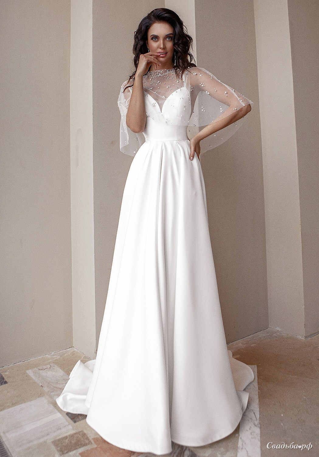 Приталенное свадебное платье в стиле минимализм. Образ на тонких лямках дополняет небольшой съемный кейп из фатина.