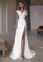 Элегантное свадебное платье, расшитое мерцающими пайетками. Образ дополняет высокий разрез, спинка открыта.
