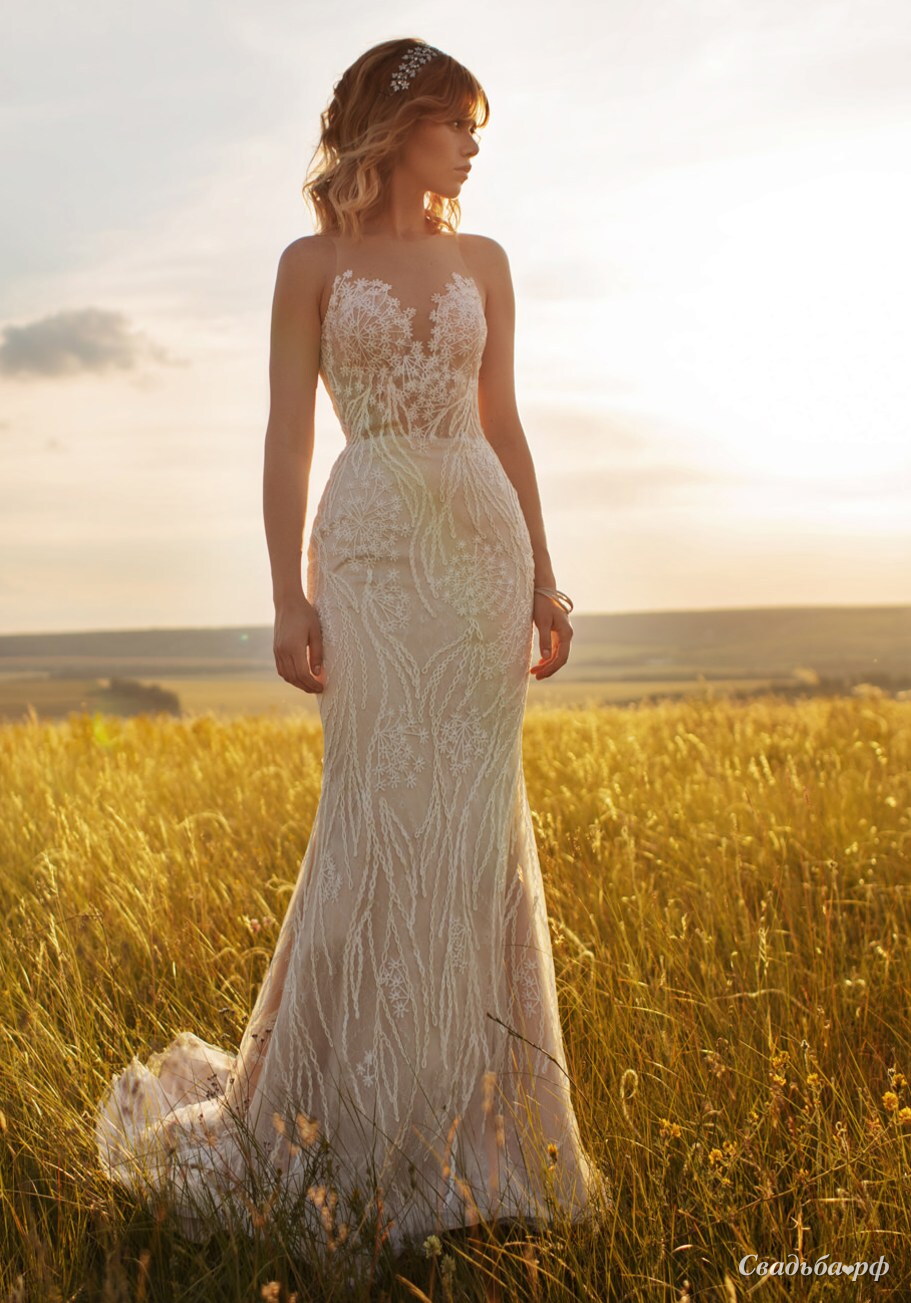 Кружевные свадебное платье-трансформер в оттенке слоновой кости. Кружевная облегающая рыбка с прозрачным декольте облегает бедра и переходит в шлейф. Платье можно дополнить кейпом или шлейфом.