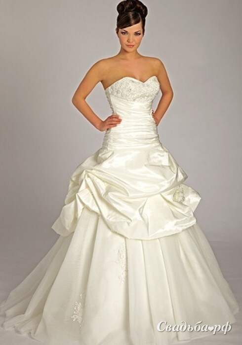 Невероятно красивый силуэт создает сваденое платье в стиле «принцессы». Его отличает плотно подогнанная по фигуре верхняя часть и трапециевидная юбка. Лиф украшен ненавязчивыми декоративными элементами, хорошо держит грудь и привлекает внимание. Драпированный ореол вокруг юбки придает торжественность образу.