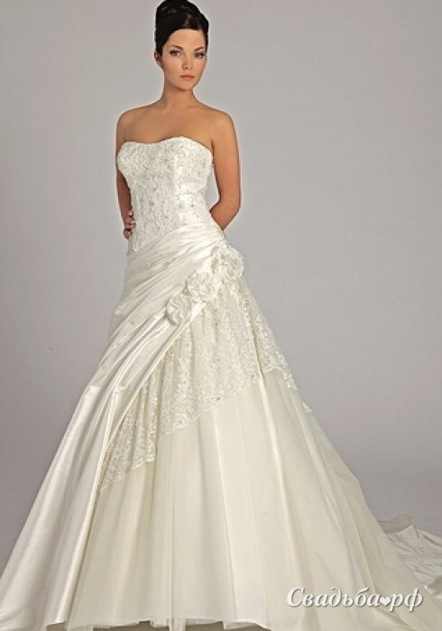 Классическое свадебное А-силуэтное платье созданно из сочетания нескольких видов тканей. Более плотный материал формирует верхнюю часть платья и красивыми складками падает на юбку. Пышная легкая почти невесомая юбка декорирована кружевной вставкой. Лиф расшит стразами и вышивкой. В этом платье вы будете просто великолепны.