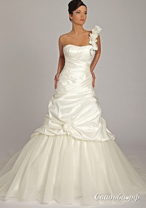 А-силуэтное свадебное платье сшито в сочетании плотного корсетного верха и пышной фатиновой юбки. Облегая грудь, талию и бедра ткань уложена разнонаправленными диагональными линиями и переходит в крупные драпировки. Впереди юбка украшена крупным цветком. Высокая прическа и вечерний макияж дополнят благородный образ невесты. Подойдет это свадебное платье высоким статным девушкам.