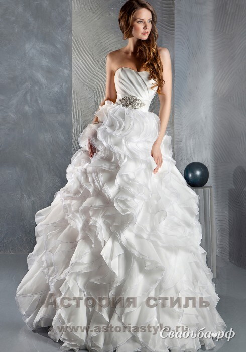 Эффектный наряд с открытой зоной декольте и крупной брошью на талии просто создано для самого торжественного дня в вашей жизни. Оригинально драпированный корсет зрительно увеличивает бюст. Пышная юбка со множеством вертикальных воланов смотрится сногсшибательно. Это потрясающее свадебное платье уже в продаже в салоне Астория стиль.