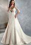 Шикарное свадебное платье классического А-силуэта с кружевными рукавами и соблазнительной зоной декольте создано для самых романтичных натур. Линия талии подчеркнута атласным пояском с бантом. Многослойная юбка струится в пол воздушными складками, расшитыми кружевом, а небольшой шлейф придает величественность созданному образу. Эта модель с завышенной талией зрительно вытягивает силуэт. В наличии размеры 42, 44, 46.
